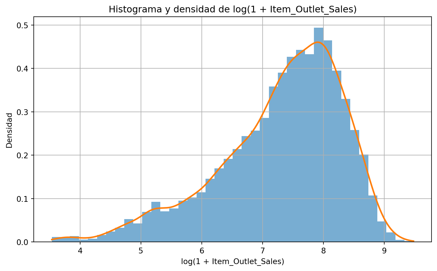 plt.figure()plt.hist(log_sales, bins=40, density=True, alpha=0.6)xs_log = np.linspace(log_sales.min(), log_sales.max(), 400)kde_log = stats.gaussian_kde(log_sales)plt.plot(xs_log, kde_log(xs_log), linewidth=2)plt.title("Histograma y densidad de log(1 + Item_Outlet_Sales)")plt.xlabel("log(1 + Item_Outlet_Sales)")plt.ylabel("Densidad")plt.tight_layout()plt.show()