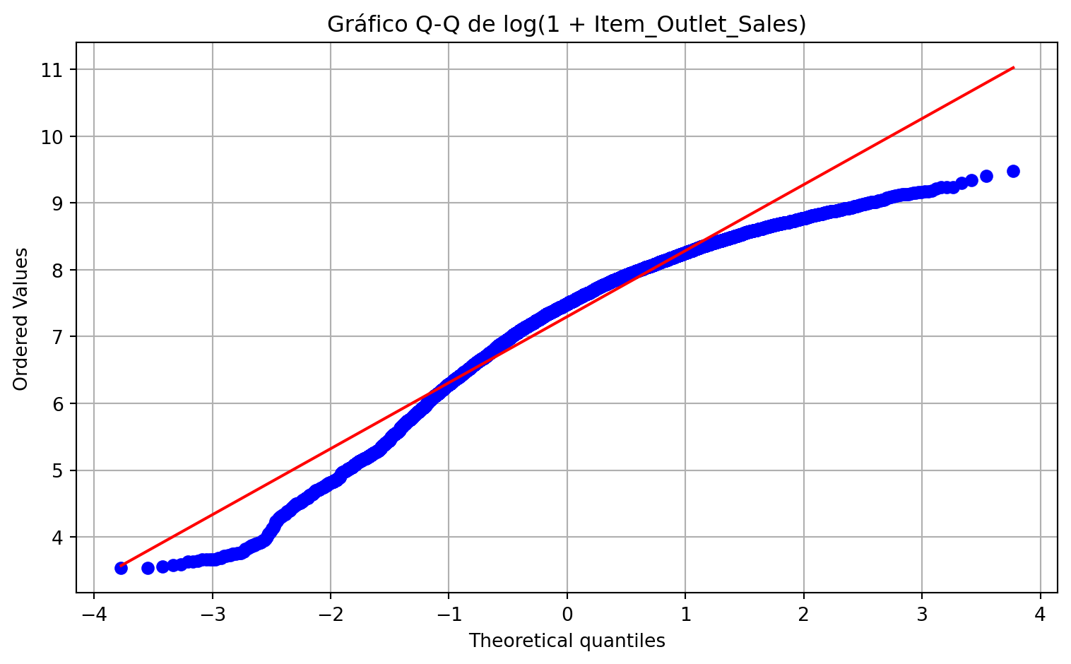 plt.figure()stats.probplot(log_sales, dist="norm", plot=plt)plt.title("Gráfico Q-Q de log(1 + Item_Outlet_Sales)")plt.tight_layout()plt.show()